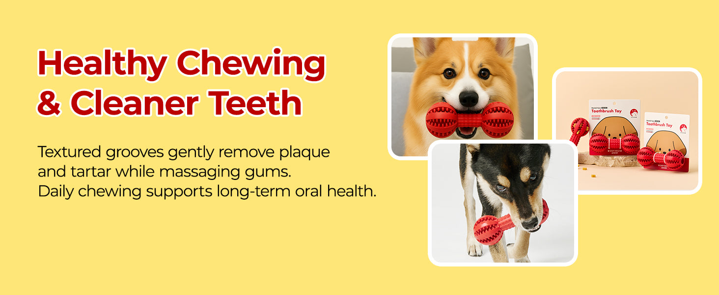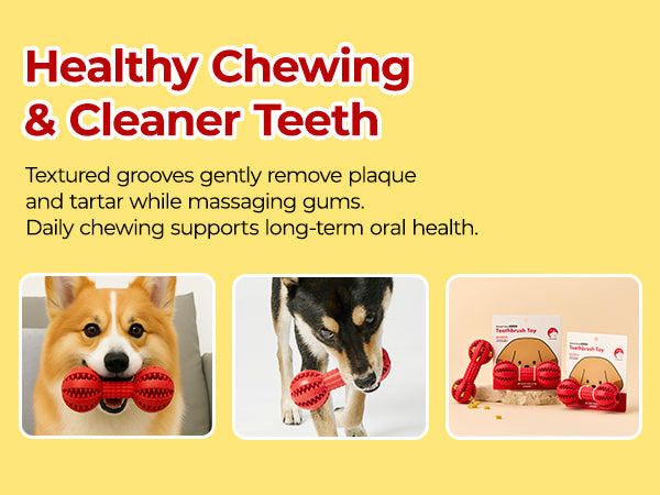 - 2-in-1 Dental Care & Play: Removes plaque and tartar while massaging gums.