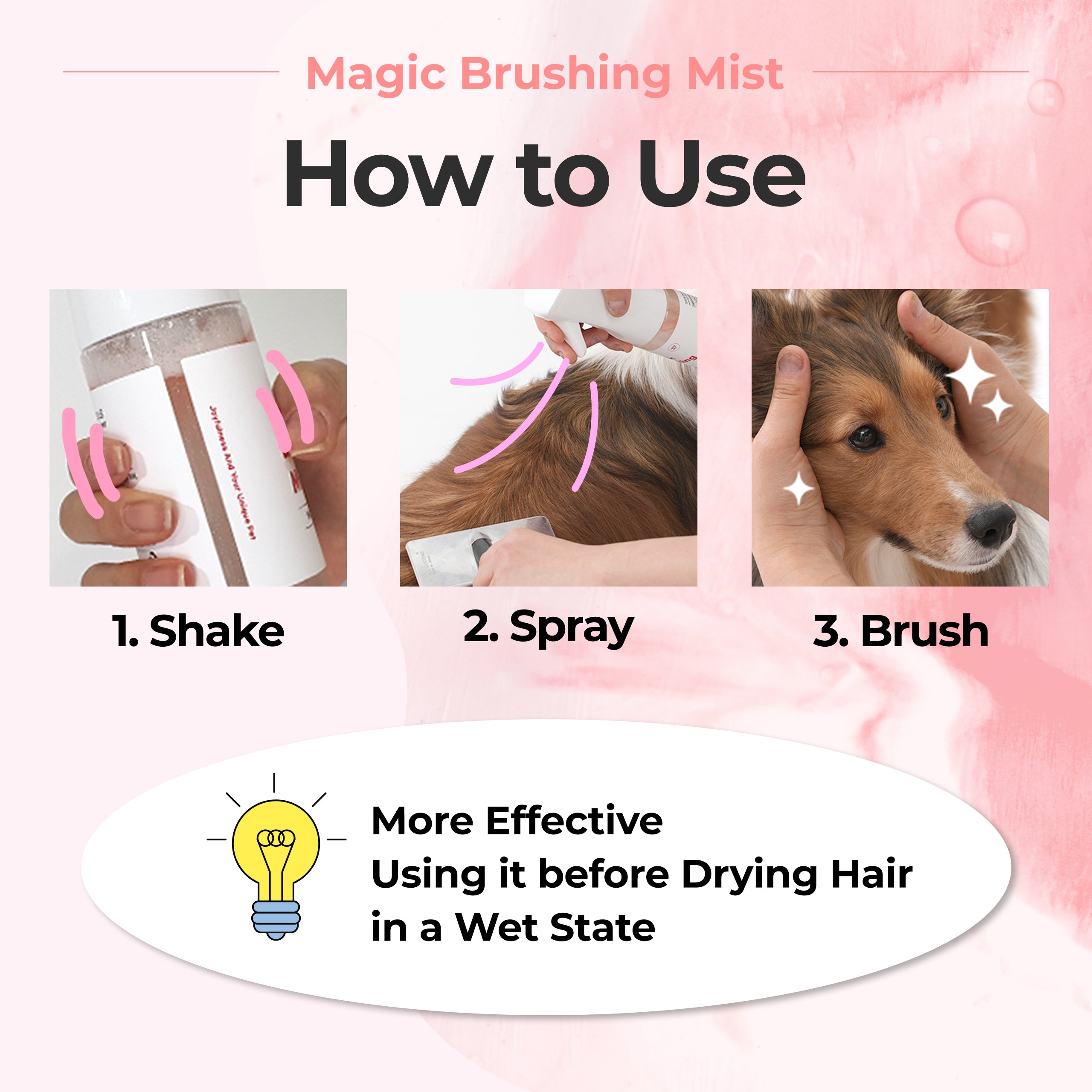 Leave-in mist for pets to reduce tangles and add shine. Low-noise spray won't startle pets. Vet-approved formula by Korean pet experts.