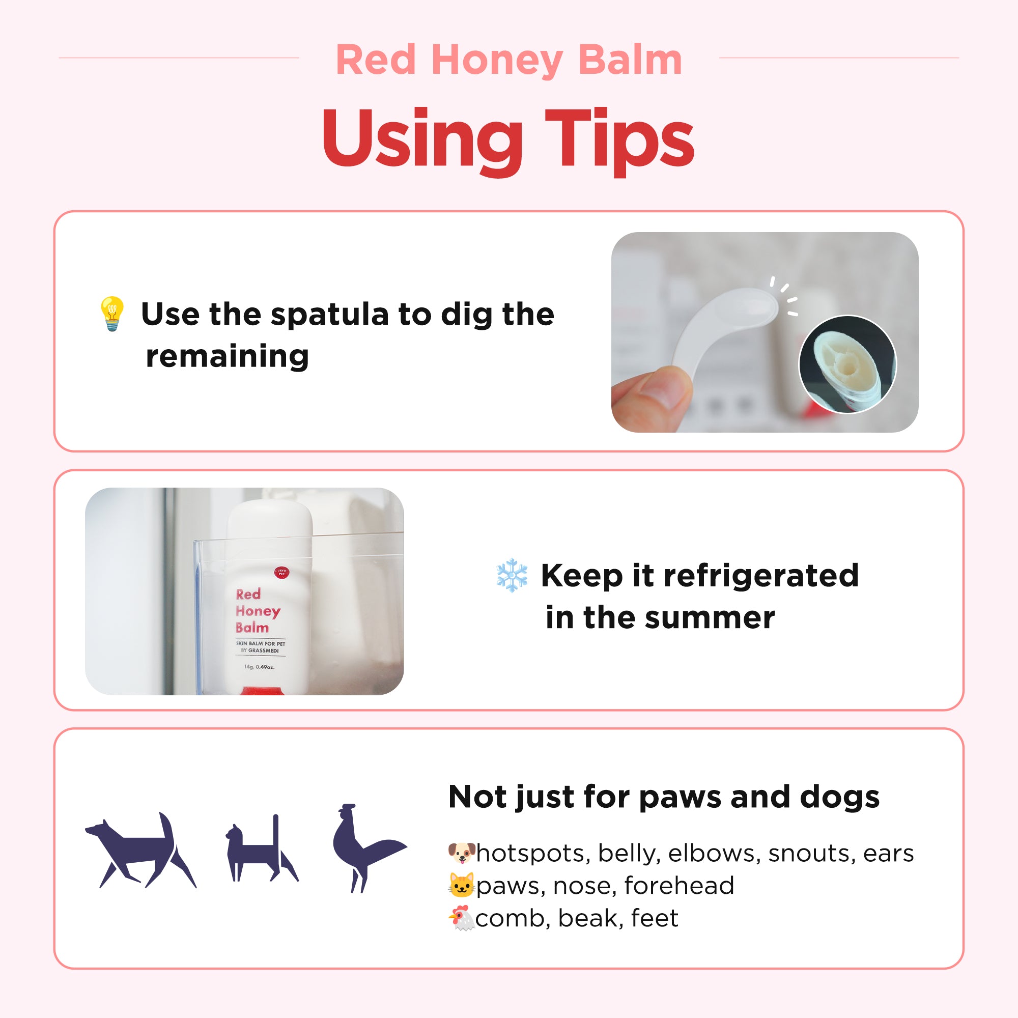 Before use, clean and dry the area thoroughly. Apply a small amount and gently massage until fully absorbed. Ideal for daily protection against dryness, cracking, and irritation. After use, wipe off any residue from the surface of the balm before closing the lid. Use the included spatula to scoop out and apply the balm from inside the container.
