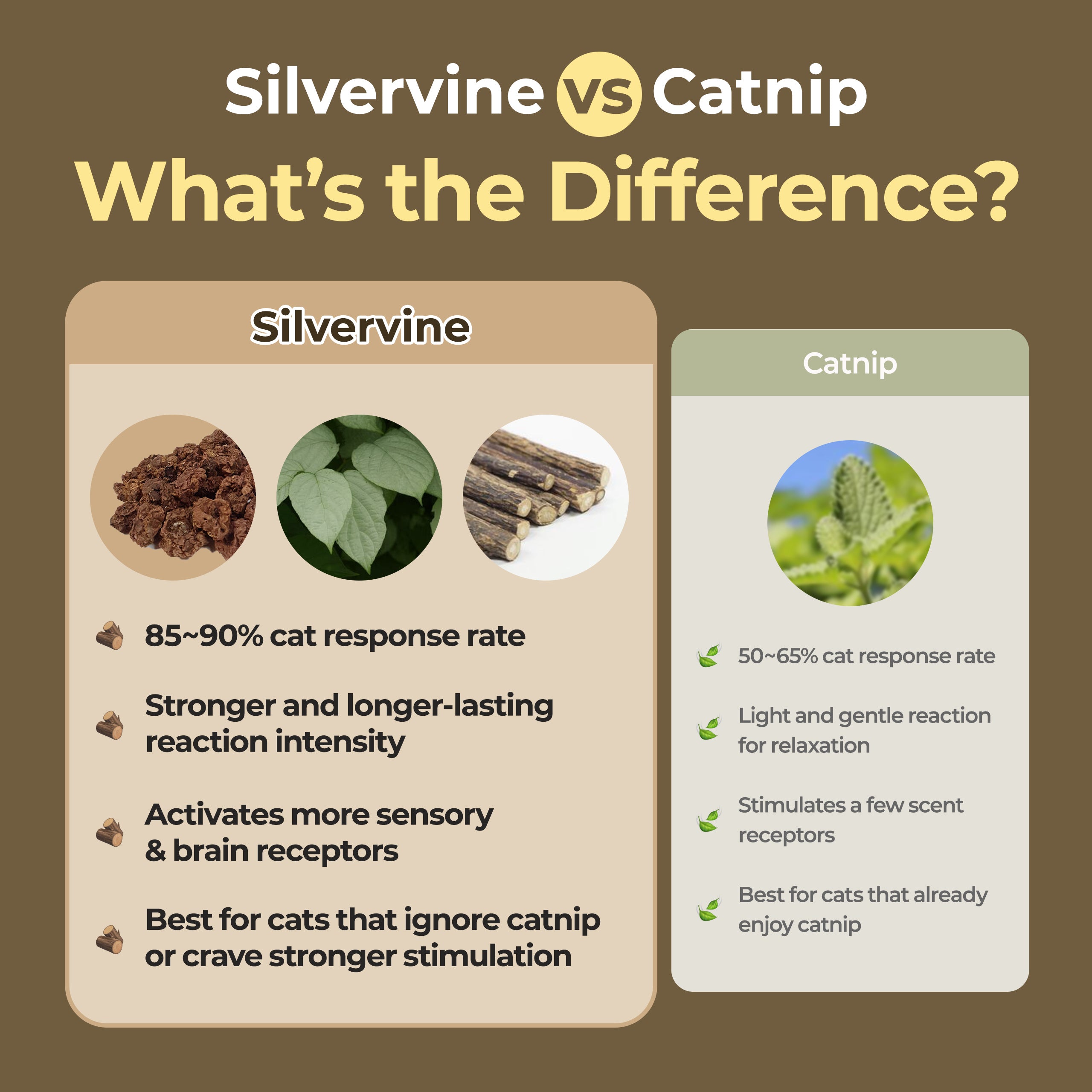 • Highly Effective: Over 80% of cats respond to silvervine, making it more reliable than traditional catnip.