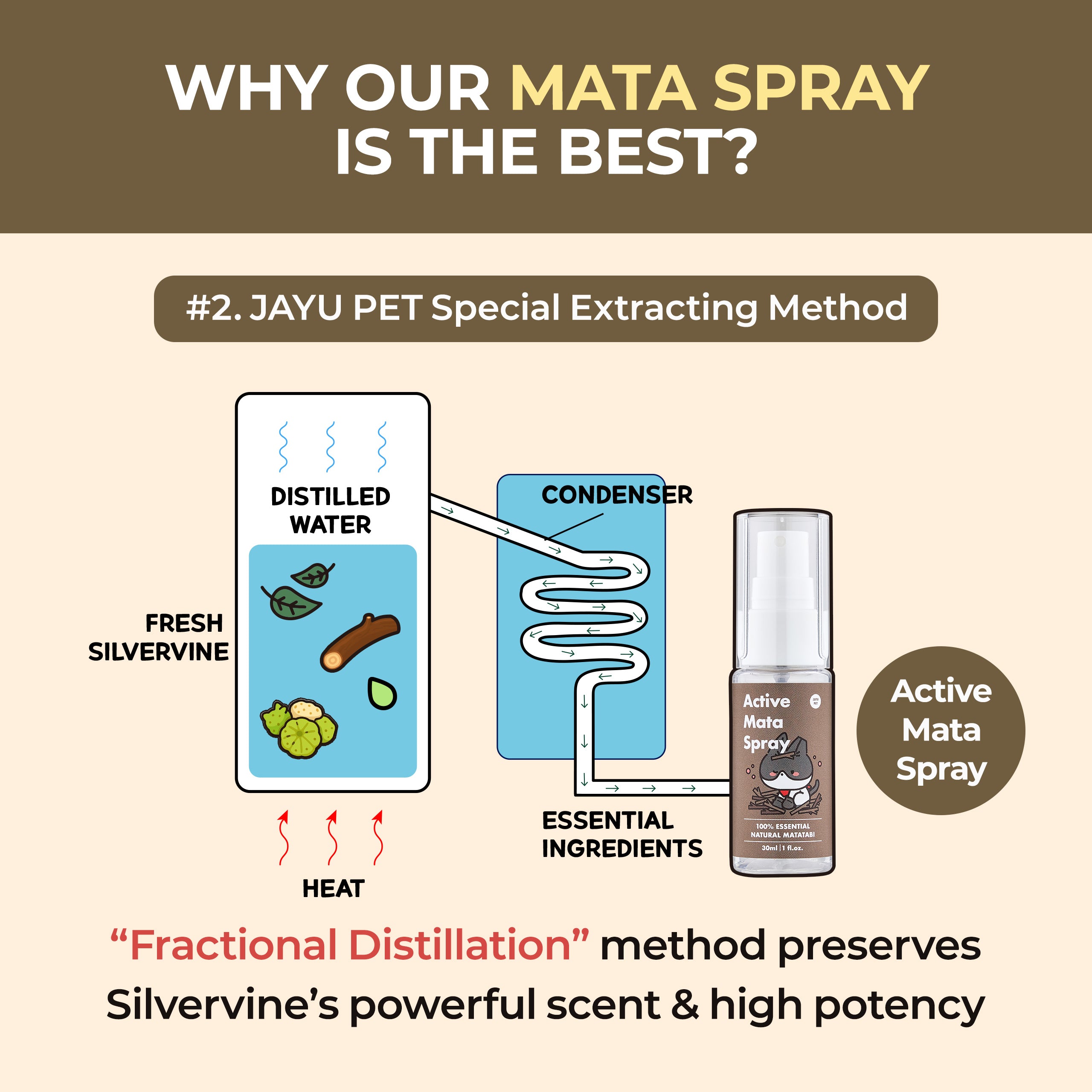Spray JAYU PET Active Mata Spray onto toys, bedding, or scratching posts to stimulate play and relaxation. Ideal for encouraging engagement and reducing stress.