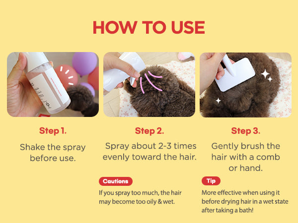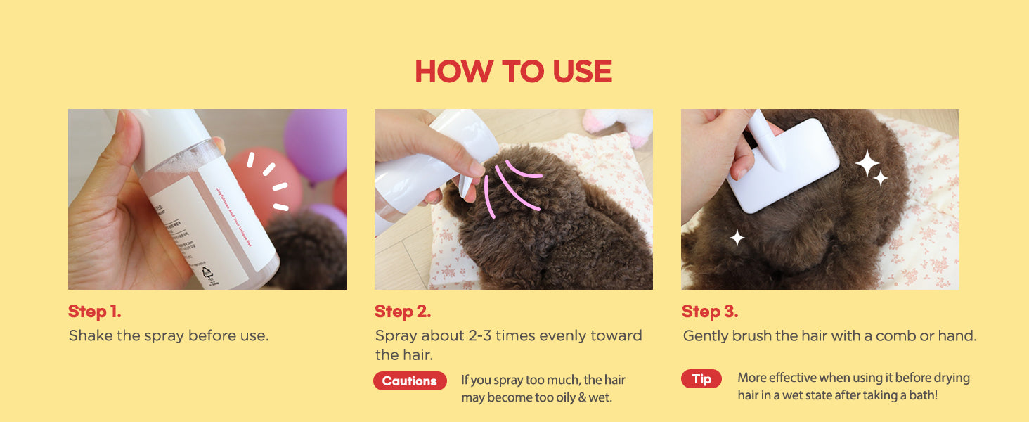 Leave-in mist for pets to reduce tangles and add shine. Low-noise spray won't startle pets. Vet-approved formula by Korean pet experts.